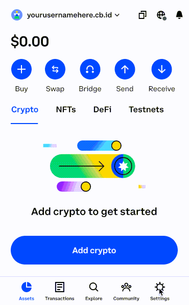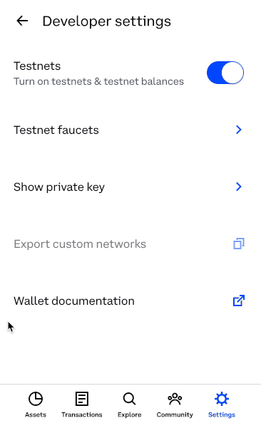 Testnets are enabled by default for the Coinbase Wallet browser extension. When enabled, Testnet assets display separately from Mainnet assets in a dedicated Testnets tab.