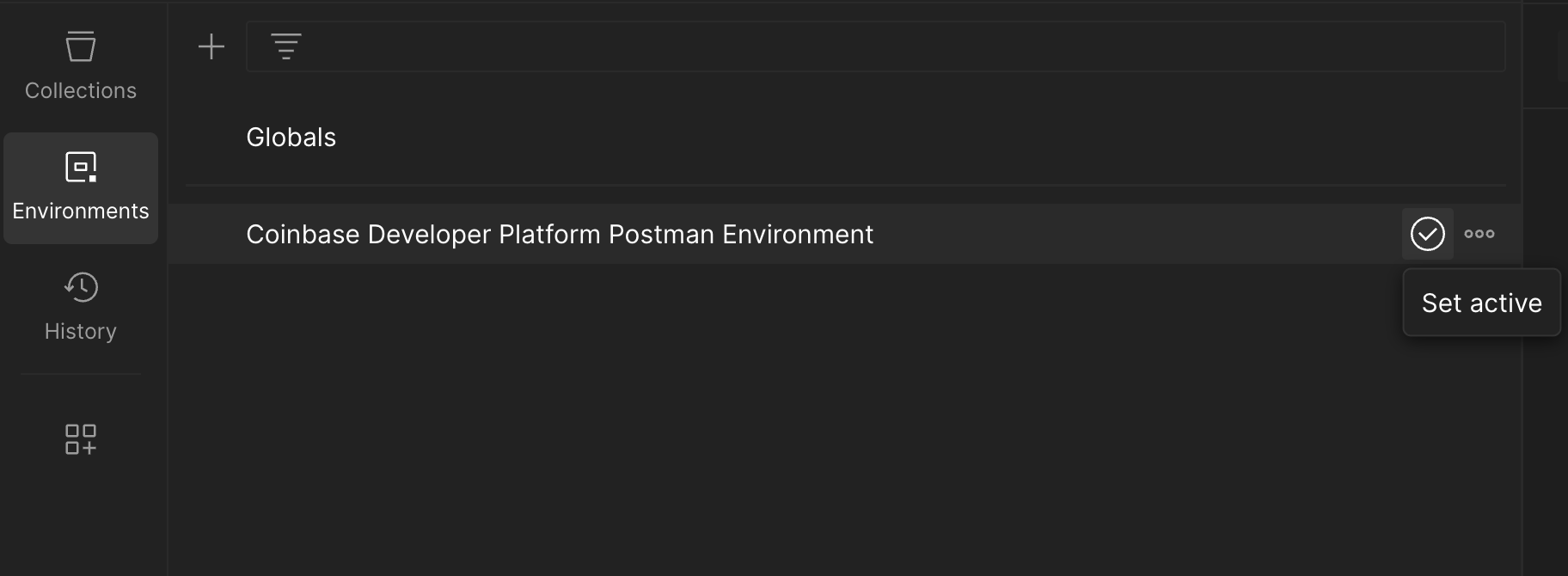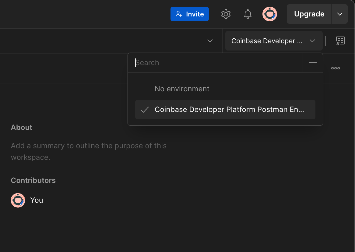 - In Postman, click on the environment dropdown near the top right of the screen and select “Coinbase Developer Platform Postman Environment”.