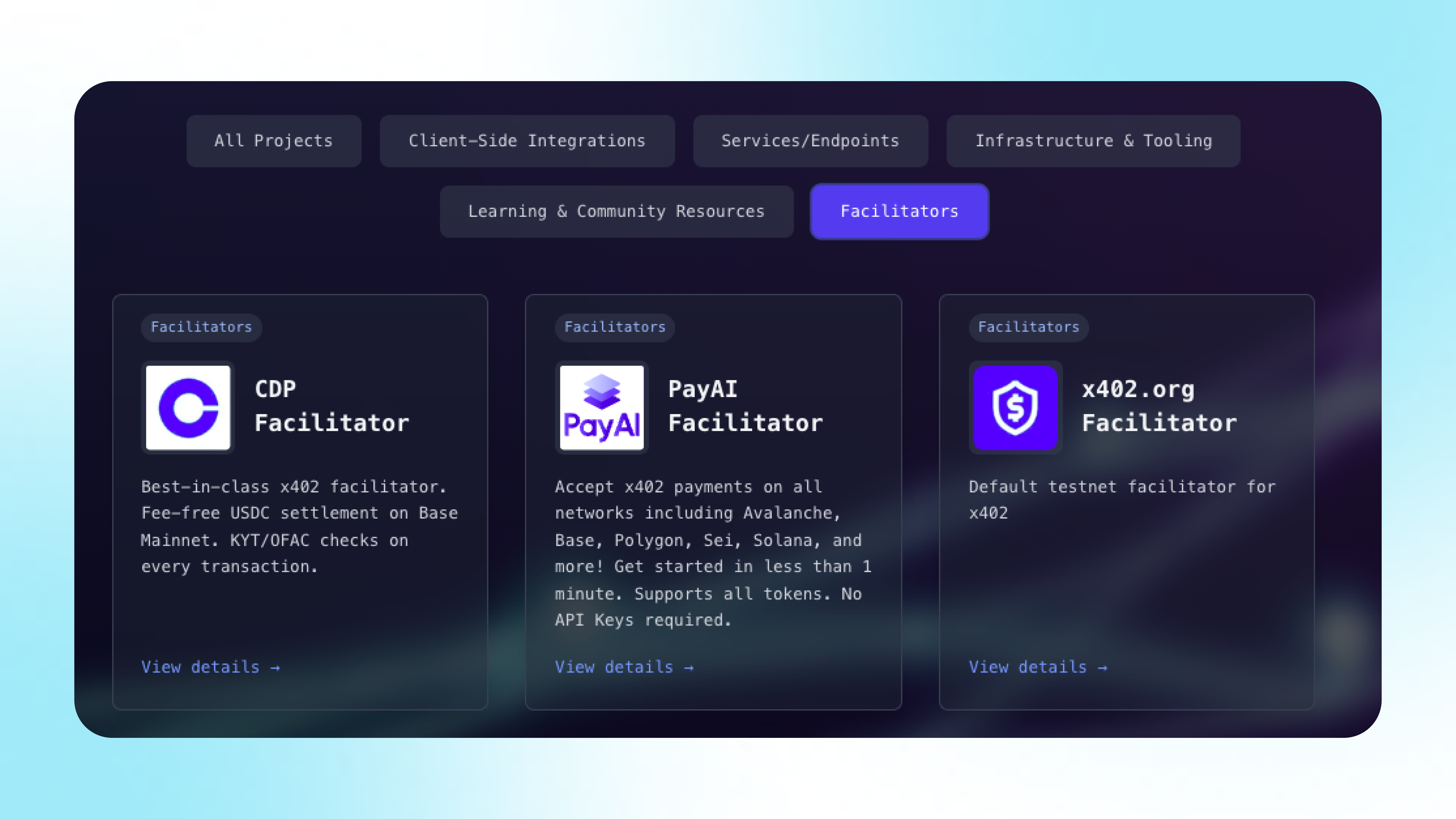 - Facilitator directory: Added a new facilitator list on x402.org for easy discovery of available payment routing providers.