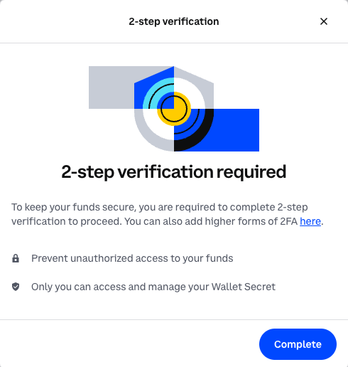 For better security posture, you should have enabled two-factor authentication (2FA) when you created your wallet. If you need to change or enable 2FA for your account: Navigate to the Security dashboard. Under the 2-step verification tab, you can add additional 2FA methods or enable/disable current methods.