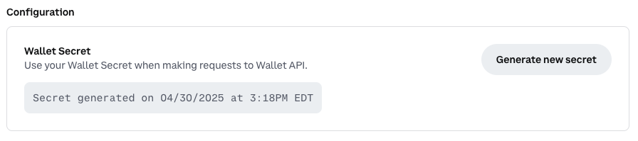 - Under Configuration, you should see when your current Wallet Secret was generated. Click the Generate new secret button to rotate your secret.