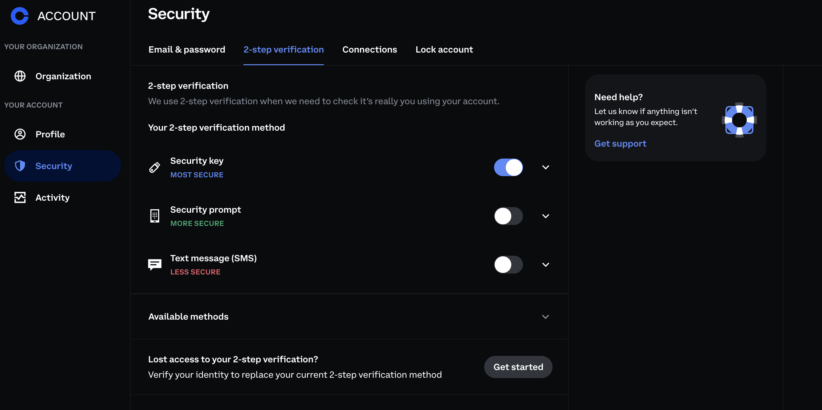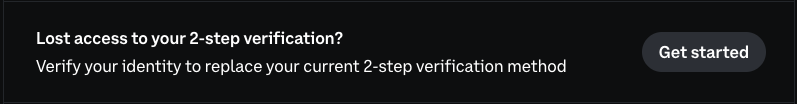 - If you lost access to your existing 2FA method, you can verify your identity by clicking Get started at the bottom under Lost access to your 2-step verification?