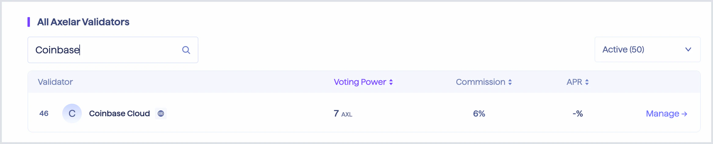 - Find the Coinbase validator from the list of validators and select Manage to begin the Delegation process.