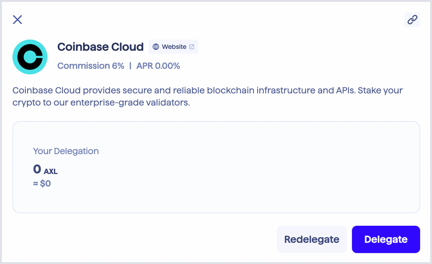 - Ensure your wallet has the number of Axelar tokens you wish to delegate, plus additional AXL to cover transaction fees.