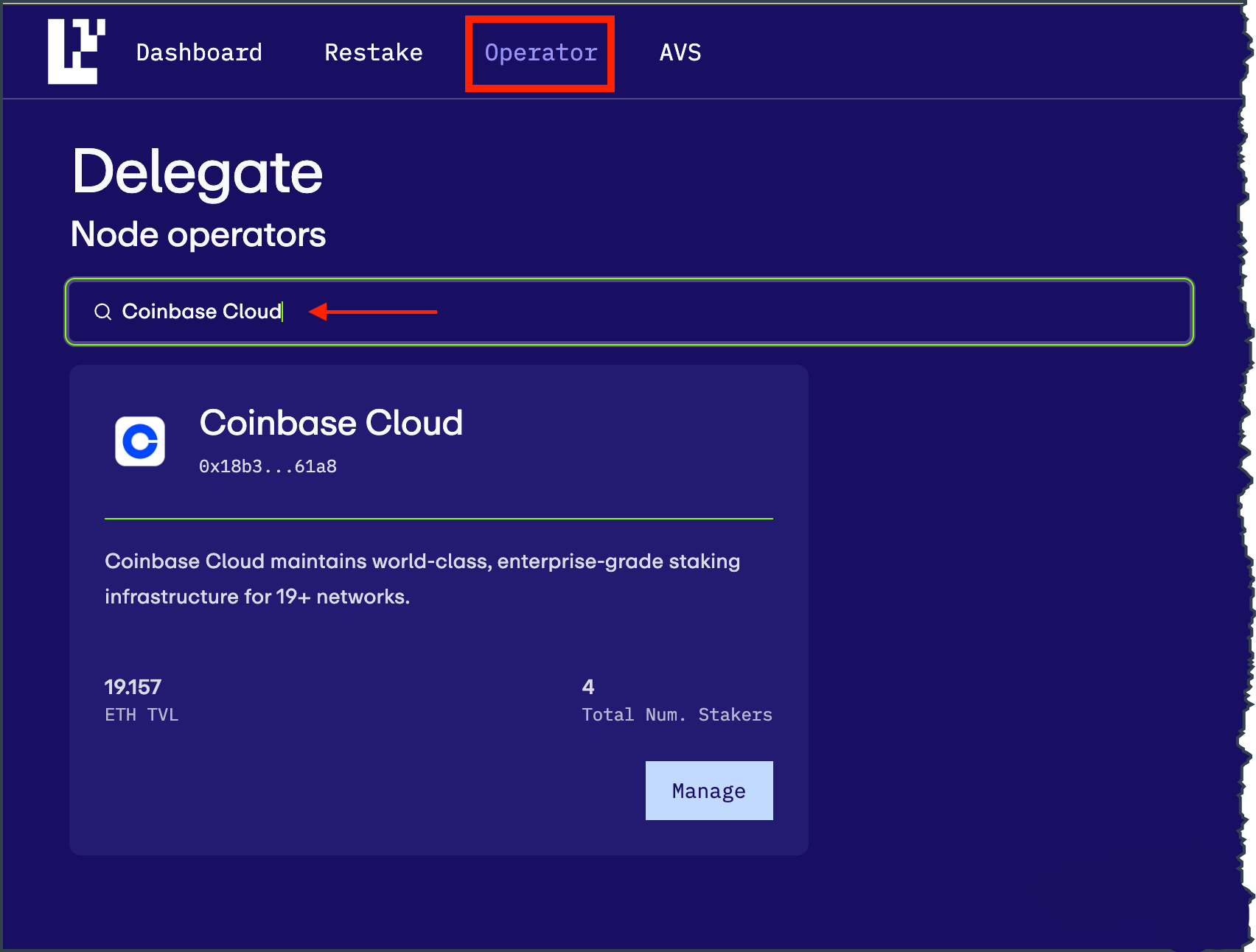 - Search for the Coinbase Operator by searching the name, then click on its Node Operator tile