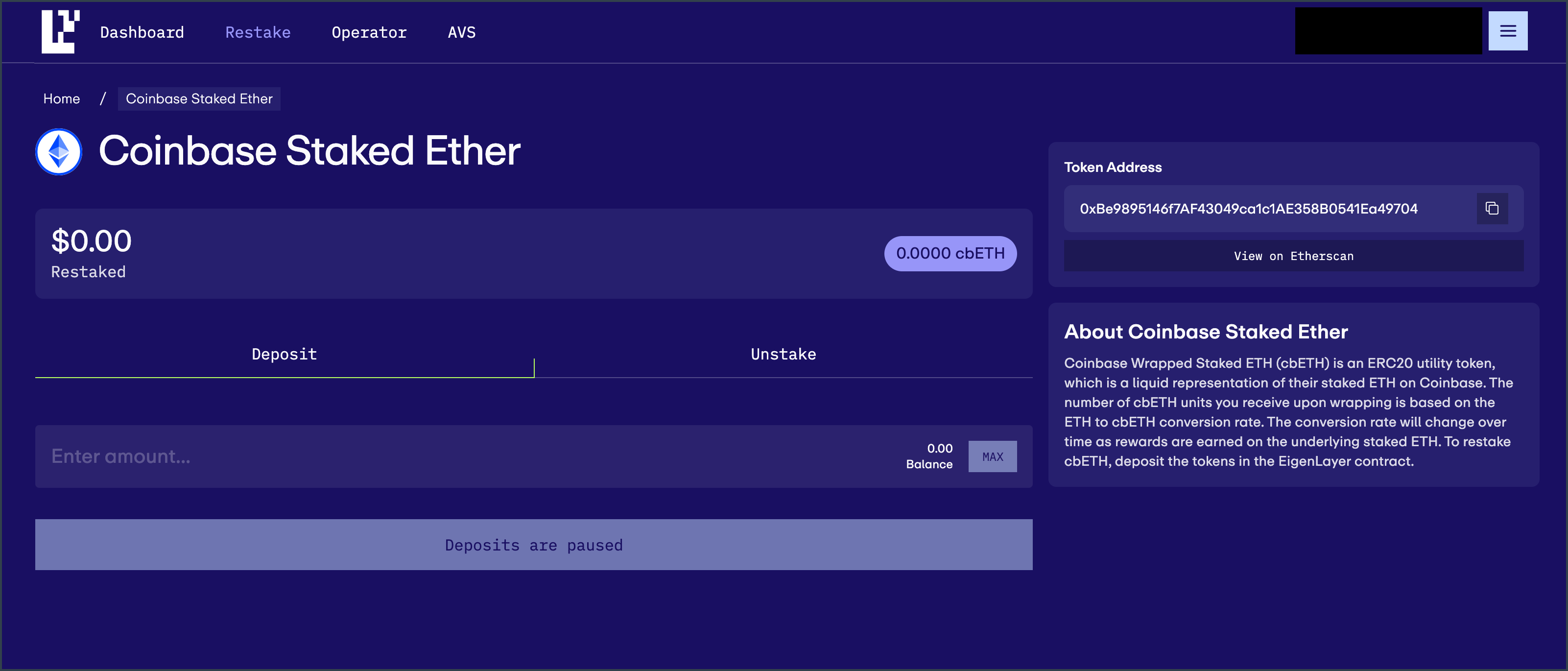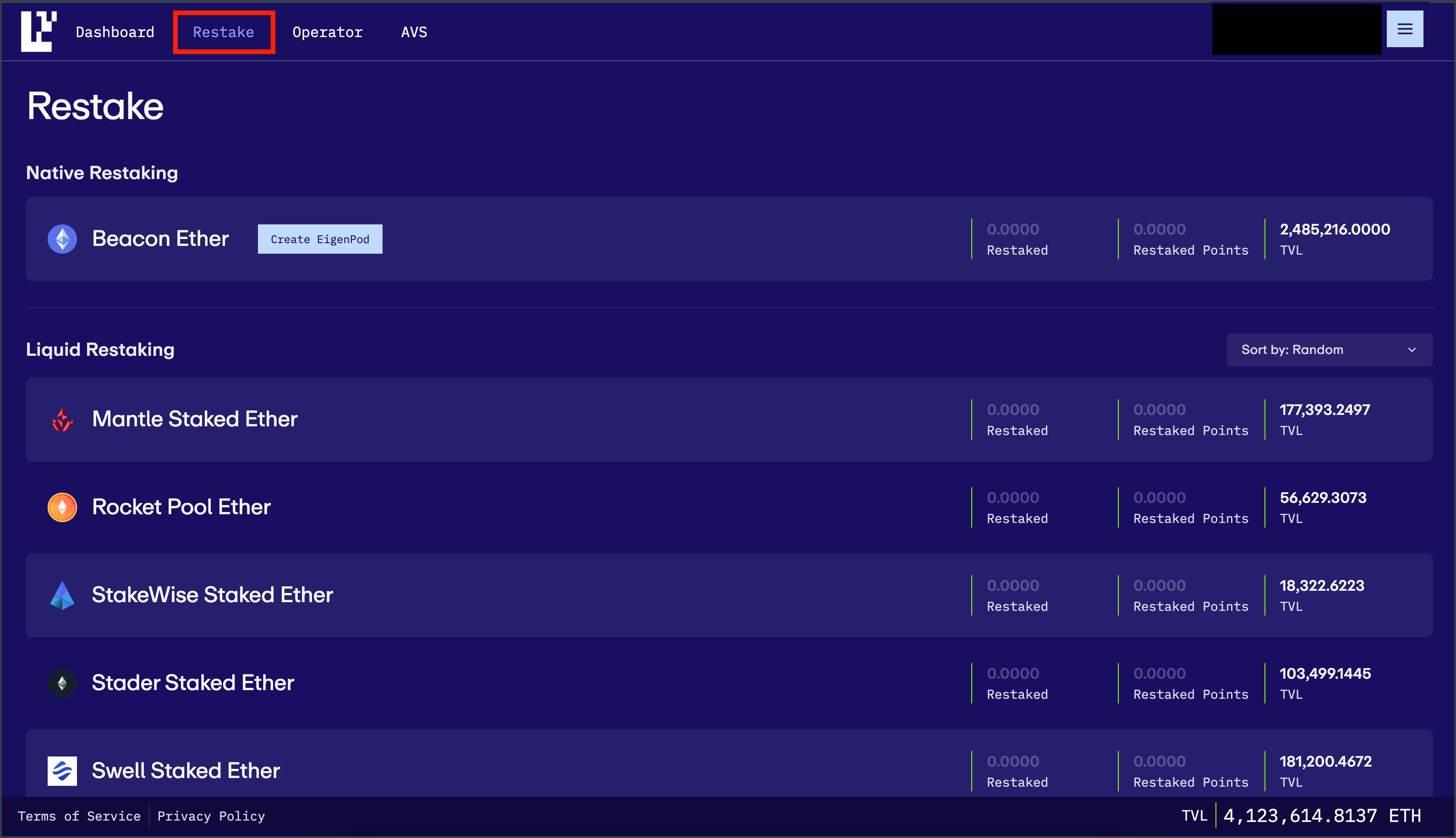 - Navigate to the EigenLayer App and click on the Restake tab.