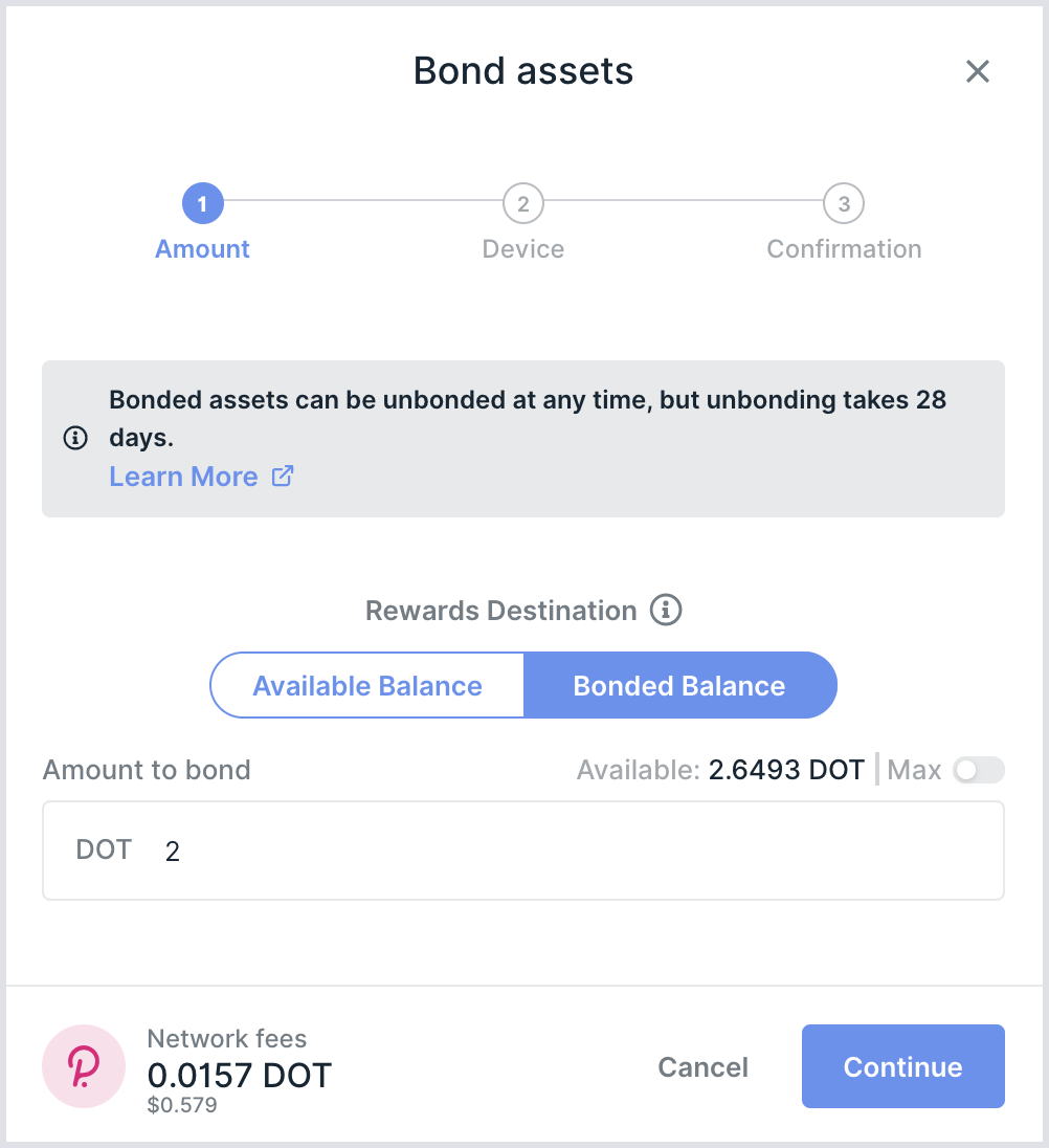 - Select Available Balance to leave your rewards un-bonded and spendable in your Polkadot account.