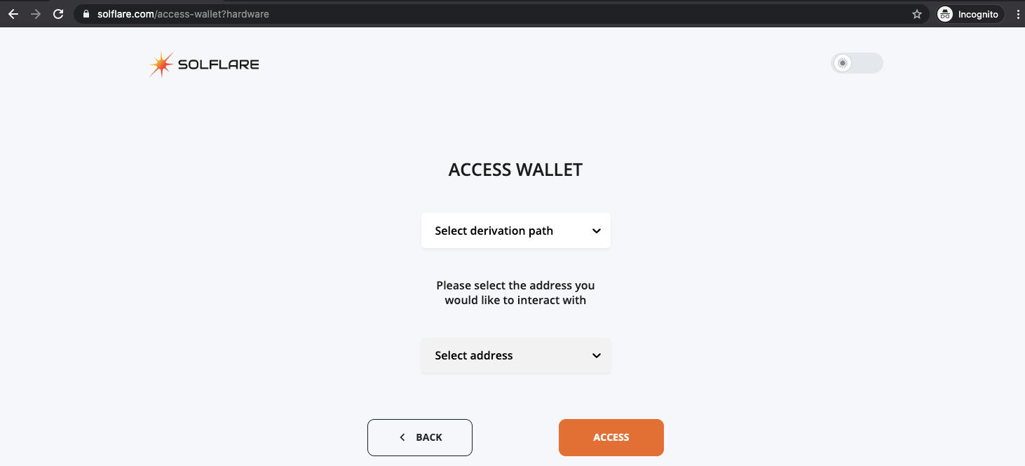 - Click the Select derivation path dropdown and select the first option, Solana - 44’/501’/.