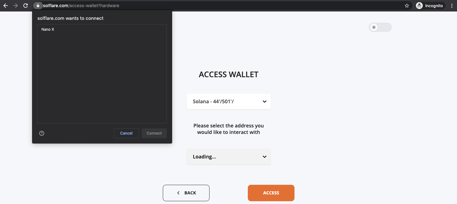 - Select your Ledger device from the pop-up screen. If the UI gives you any errors, ensure your Ledger is unlocked and has the Solana app open.