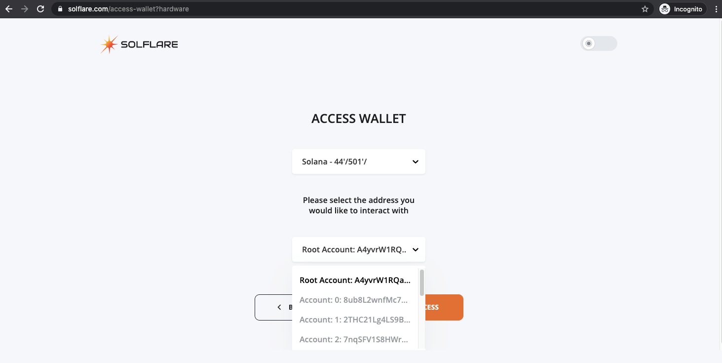 - Select Using Ledger Nano S or X and click Access.