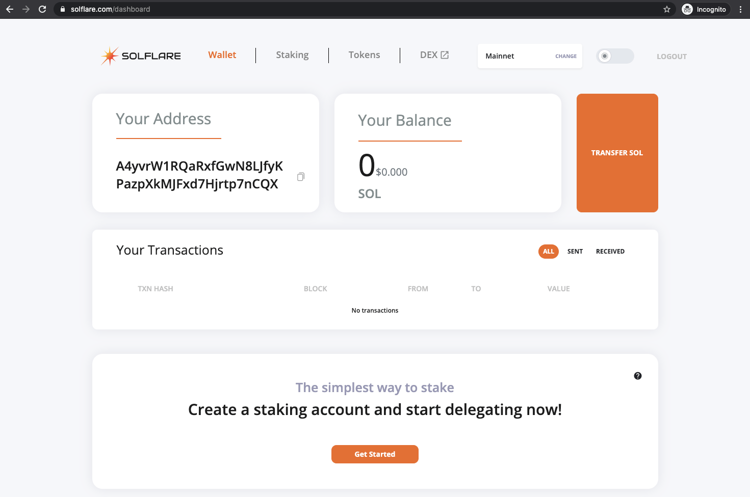 - After waiting the network processing time, your SOL balance should show at the top of the SolFlare wallet extension when opened.