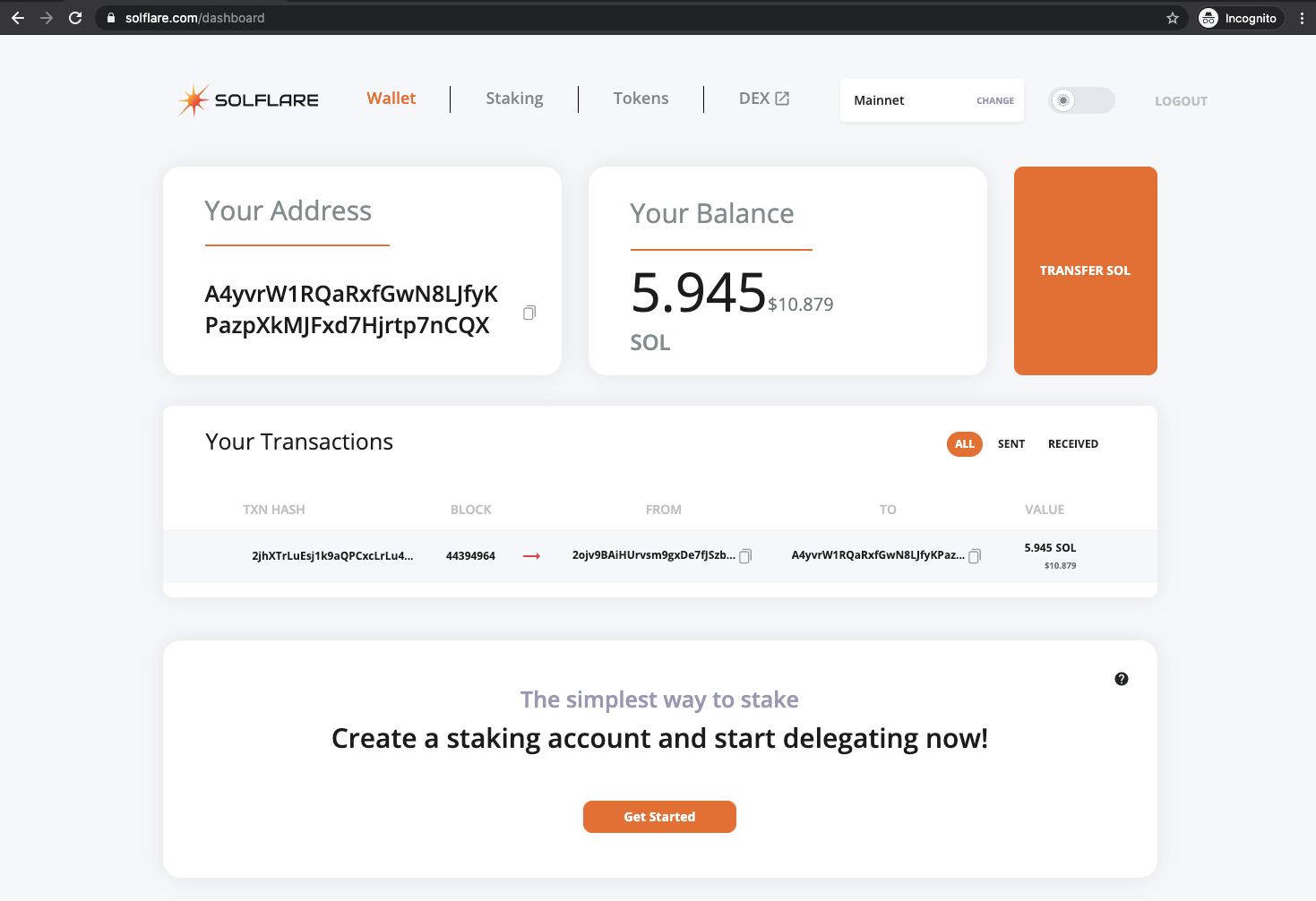 - Open the SolFlare UI, and under Create a staking account select Get Started.