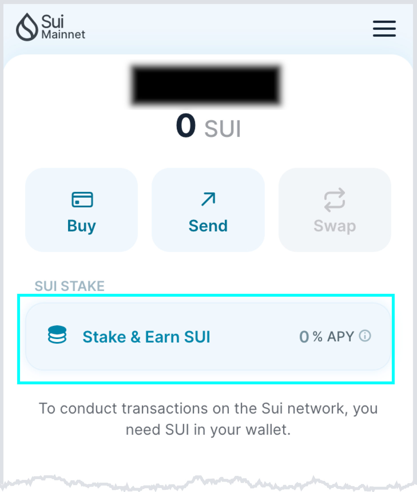 - After creating and opening your Sui Wallet, click on Stake & Earn SUI.