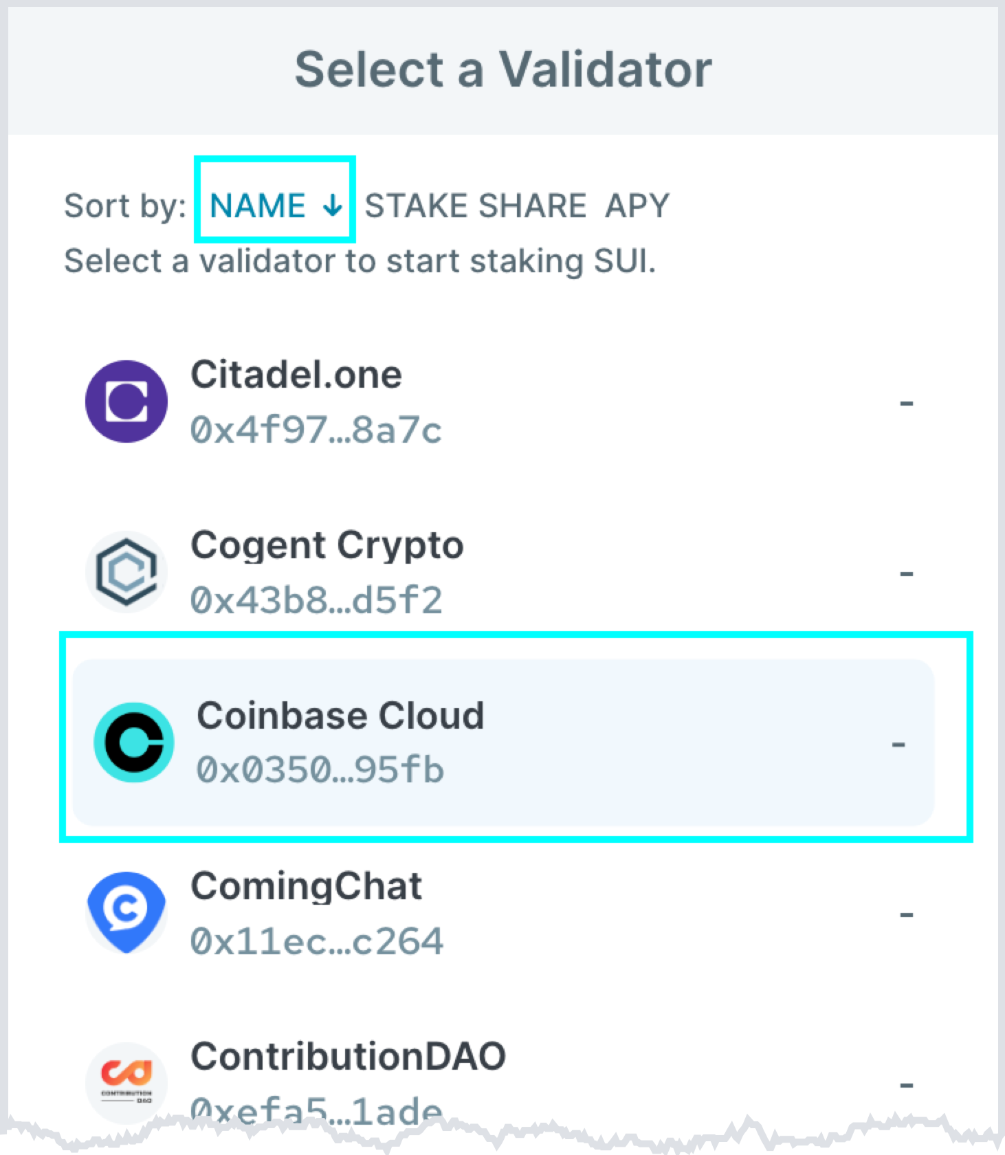 - Navigate to Coinbase validator by scrolling down. (Sorting by name in descending order can help.)